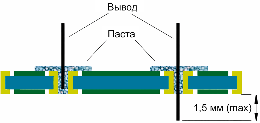 Для предотвращения выдавливания пасты из отверстия при установке компонента длина вывода не должна превышать толщину платы более чем на 0.5–0.8 мм. Избыточная длина вывода приводит к стеканию припоя и непропаям со стороны источника тепла.