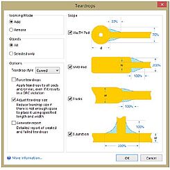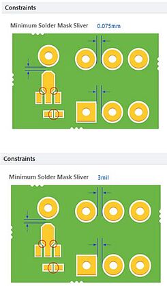 Многие проектировщики печатных плат используют практическое значение примерно 50µm для определения длины окружности площадок и минимум 50µm для остаточного покрытия до следующей дорожки. Однако, если вы хотите получить мостик из паяльной маски между двумя площадками, оно должно быть по меньшей мере шириной 75µm. Эти факторы нужно принимать во внимание во время подготовки компонентов в библиотеке, также как и при размещении компонентов на печатной плате. В противном случае это может привести к тому, что зазоры будут слишком маленькими и маска не сможет качественно заполнить пространство между площадками.