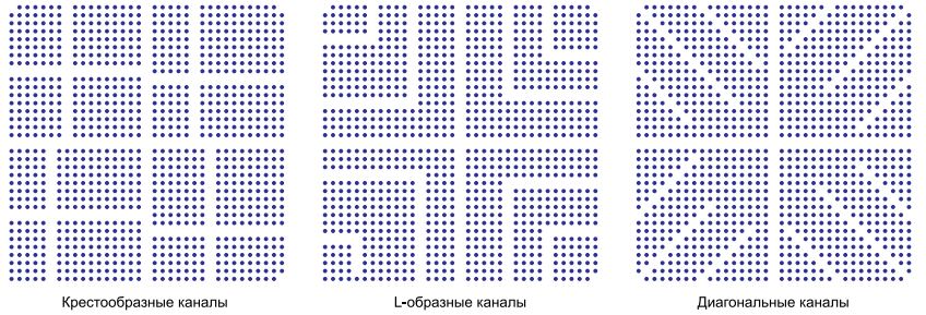 Однако использование глухих переходов дает возможность развести шесть трасс под ними, что увеличивает пространство для разводки на 30%. Применение данного метода при разводке трасс от BGA с большим количеством выводов сокращает число необходимых сигнальных слоев в 4 раза. При этом глухие переходы размещаются в виде крестообразных, L-образных или диагональных структур, формируя так называемые бульвары (рис. 3).